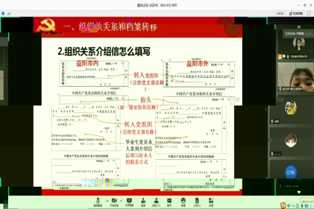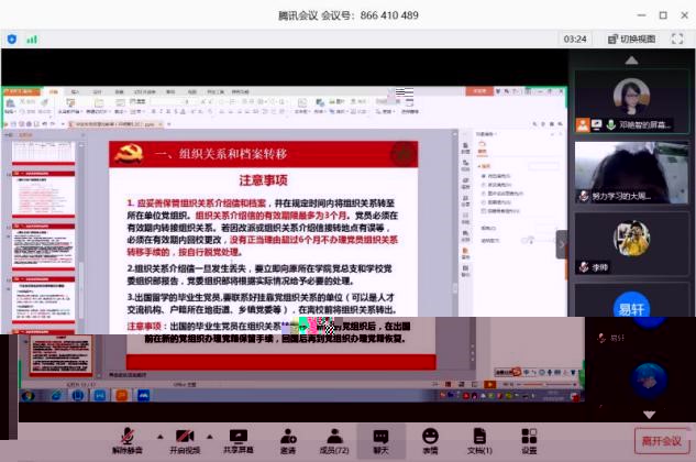 會上,首先由院組織員鄧豔智老師向全體畢業生黨員講解了組織關系轉接事宜。黨員組織關系是指黨員對黨的基層組織的隸屬關系,黨章規定,每個黨員不論職務高低,都必須編入黨的一個支部、小組或其他特定組織,參加黨的組織生活,接受黨内外群衆的監督,黨員的組織關系一經确定,黨員就可以而且必須參加該組織的生活,并在其中積極工作。同時,黨員組織關系介紹信是黨員變動組織關系的憑證,沒有轉移黨員組織關系或開具黨員證明信的,新的單位黨組織不得承認其黨員身份和安排其參加黨的組織生活。