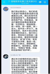 接着,各支部書記組織支部成員學習疫情中湧現的一批英雄人物,如武漢金銀潭醫院院長張定宇的不忘初心、“舍小我、顧大我”的精神、“用生命守護生命”的崔靖、戰鬥在最後一刻的大艾等,并結合熟知的相關事件發表個人看法。